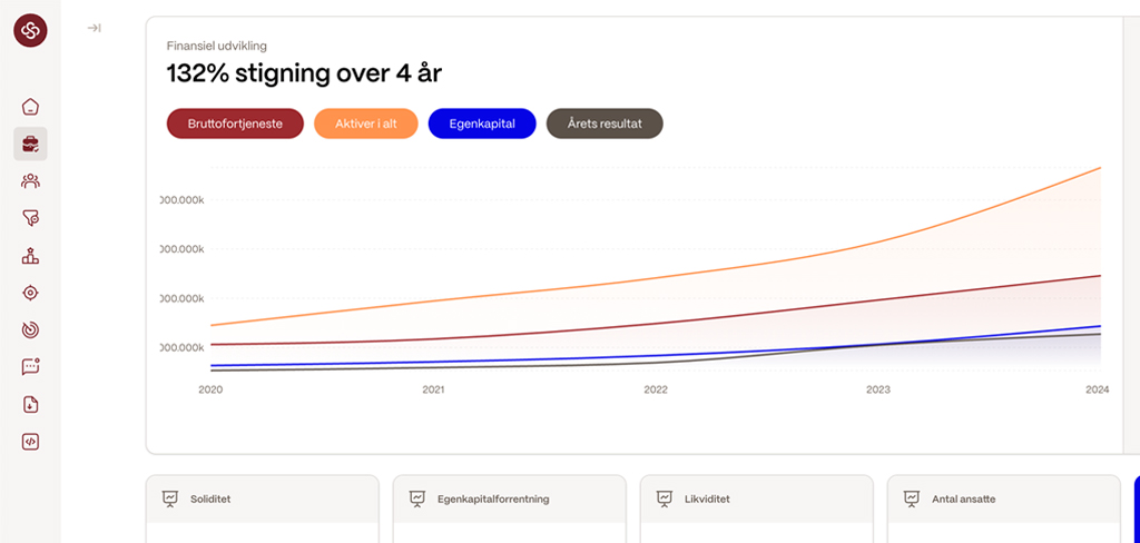 Analyser potentielle investeringers økonomi med 5 års regnskabshistorik og AI-drevet vurdering. Sammenlign porteføljevirksomheder side om side på nøgletal som soliditetsgrad, afkastningsgrad og vækst. Overvåg din porteføljes virksomheder og få automatisk besked ved vigtige ændringer som nyt regnskab, ejerændring eller statusændring.