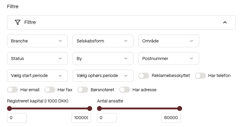 Sælger du til virksomheder med 10-50 ansatte? Eller dem med 50+ mio. i omsætning? Sæt dine kriterier og få kun relevante resultater.