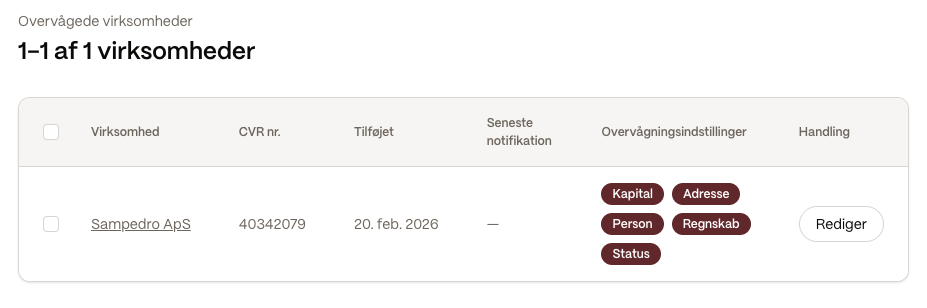 Tilføj virksomheder til din overvågningsliste og få besked når der sker noget nyt. Nyt regnskab, adresseændring eller statusændring – du ved det med det samme.